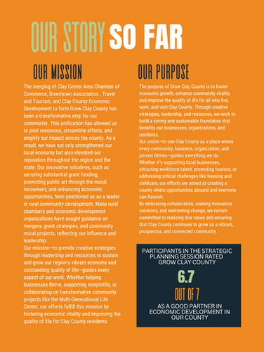 Grow Clay County was launched in 2022 in an effort to be a one-stop-shop for our community's needs. From business retention and attraction to day-trippers passing by we are here to help! Our goal is to increase community vitality and economic prosperity by implementing a bottom-up approach, building on existing assets all while attracting new ones. We focus on helping businesses, training the workforce, ensuring economic infrastructure such as affordable housing, childcare, and providing a rich quality of life for our citizens and guests. We encourage all to embrace our space!